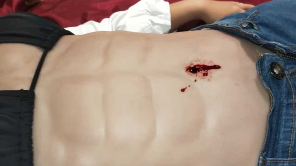 An Asian female fitness model is stabbed in the navel with a knife. After the knife is pulled out, the killer inserts his finger into her navel and plays with her guts. She then gets a hard punch to her six pack abs. Will she survive the torture?