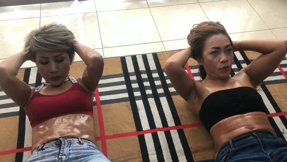 A fitness model and a female bodybuilder is having a contest to see who has the strongest abs. After 5 hours of sit-ups, none of them won't give up. The female bodybuilder challenged the fitness model to do sit-ups with a knife in the navel. Both girls took out their knives and stabbed it halfway into their own navel. They then continued their sit-up. After 5 more hours, both girls were still going strong, so the fitness model suggested to stab the knife all the way to the hilt. With the full knife now inside the navel, they then continued their sit-ups.