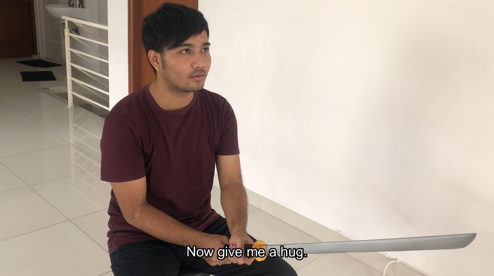 A guy doesn't believe that his girlfriend loves him. She asked how to prove it. He told her to take her shirt off and then picked up a sword. He then asked her to hug him. The girl tried to hug him despite having to impale herself in the navel with the sword in order to do so. She kept trying to hug him even after the sword went out her back but she was still unsuccessful.