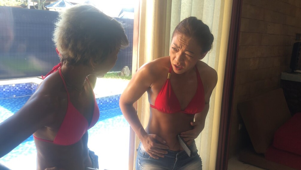 After a few minutes, they both woke up at the same time because it was time for them to return inside. Incredibly, they still haven't realized that there's a knife stuck in their navel! Once inside though, both suddenly grunted from the sharp pain in their belly. They accused each other of stabbing the other. They both grabbed the knife of the other and then stabbed the knife all the way to the hilt. Both girls ended up killing each other instead of being killed by a serial killer.